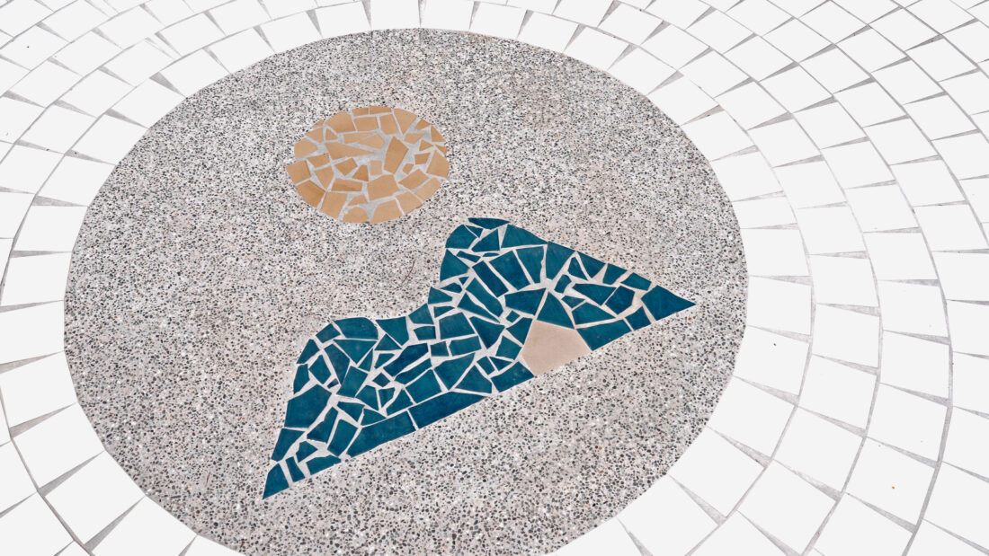 設計上我們用拱形鐵件把空間拉出弧線;馬賽克地磚拼出山巒日出的標誌,讓廣場有了溫度。